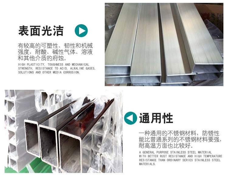 304不锈钢方矩管是一种中空的长条钢材,因为截面是正方形所以叫做方管。大量用作输送流体的管道,如石油、天燃气、水、煤气、蒸气等,另外,在搞弯、抗扭强度相同时,重量较轻,所以也广泛用于制造机械零件和工程结构。
